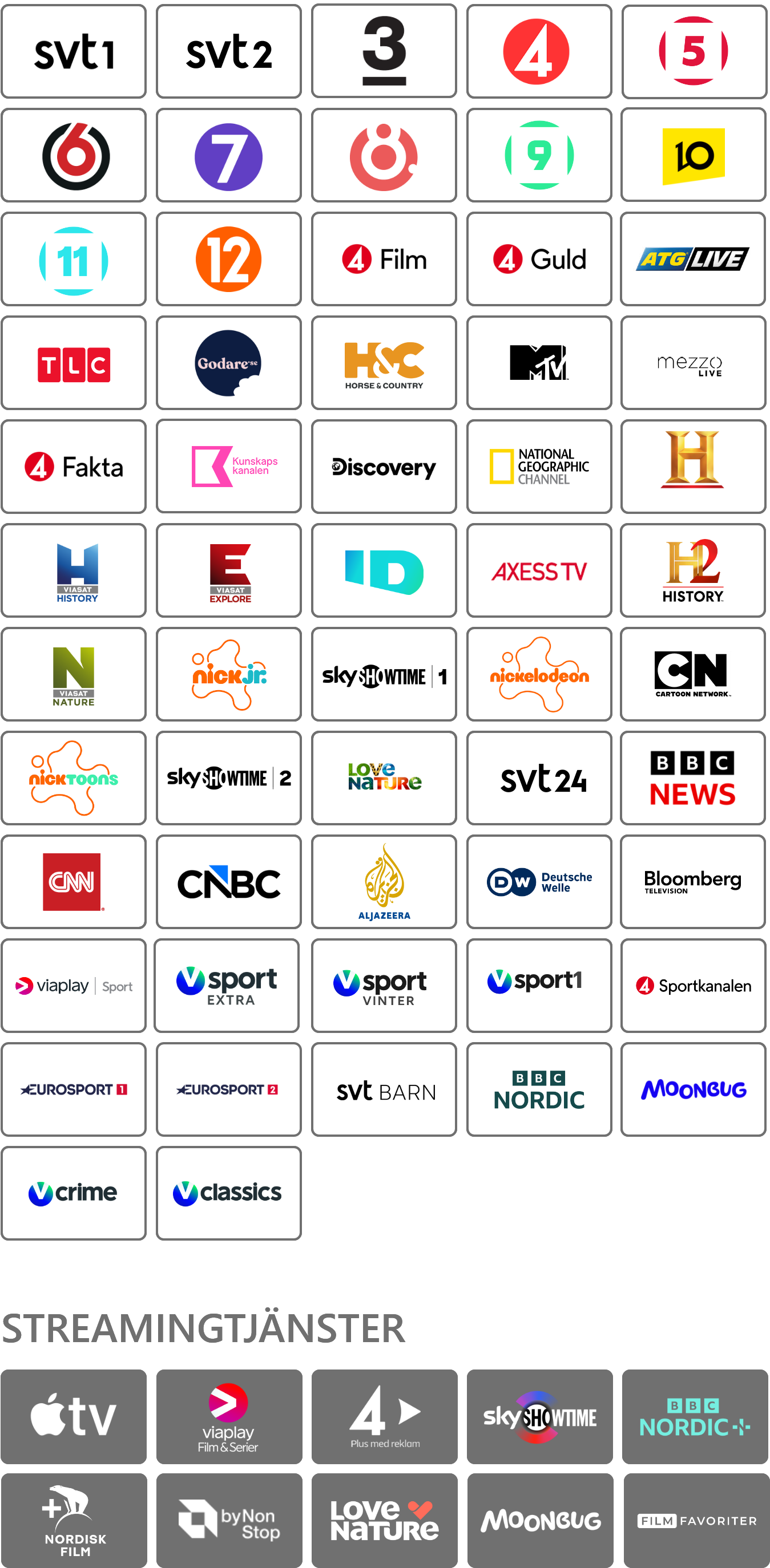 Familjefavoriten med en perfekt mix av underhållning, sport och streaming! Här får du ett brett kanalutbud med mycket att välja på – sport, fakta, nyheter, underhållning och massor av tv för barn. Även flera streamingtjänster, inklusive Viaplay, ingår via Allentes app.